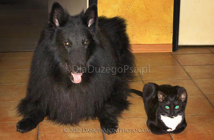 aby z przysłowiowych wrogów, zrobić przyjaciół. Na zdjęciu widzicie naszą 9-miesięczną kotkę Zuzę, która sama wybrała nasz dom, tak po prostu weszła przez otwarte drzwi balkonowe i została z nami. Nadmienię, że w naszym domu już mieszkały 2 psy – 6-letni Uzi i 10-letni Bari. Ten duży pies na zdjęciu obok Zuzi, to Uzi Polaris, nasz owczarek belgijski groenendael. On waży 35 kilogramów, ona może ze 3 kilogramy. Biorąc pod uwagę scenariusz według ludzkiej wersji jak pies z kotem, to Zuza ze swoją wagą ledwo wystarczyłaby na śniadanie Uziego. Ale jak widzicie, to przyjaciele. Mieszkają razem w jednym domu. Uzi, jako facet, dżentelmen i dobrze wyszkolony pies, ustępuje Zuzi w wielu sytuacjach, również czeka cierpliwie, aż ona naje się z jego miski. Jest po prostu dobrze wychowany. Uzi przez rok jeździł na szkolenie. Od samego początku, kiedy Uzi znalazł się w naszym domu, uczony był przyjaznej, otwartej postawy do ludzi, dzieci i innych zwierząt. Gdy był mały i później, nigdy nie broniliśmy mu kontaktów z innymi zwierzętami.